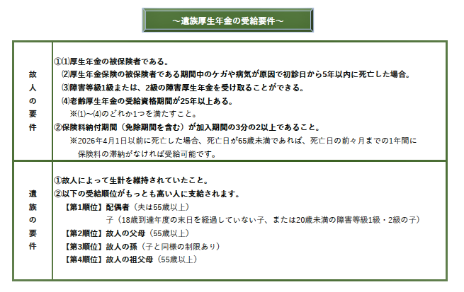 これに対し、遺族厚生年金は厚生年金保険の被保険者が死亡した場合、厚生年金の被保険者であった期間に患った病気やケガが原因で初めて病院の診察を受けた日から5年以内に死亡した場合や、老齢厚生年金の受給資格期間が25年以上ある人が死亡した場合などに支給されます。