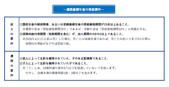 遺族基礎年金は、国民年金の被保険者が死亡した場合や、老齢基礎年金の受給資格期間が25年以上ある人(過去に被保険者であった人を想定しています。)が死亡した場合に支給されます。